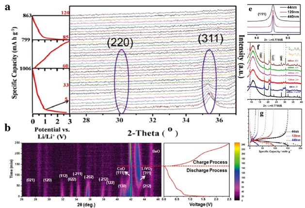 转换型负极材料:过渡金属氧化作为转换型负极材料具有理论容量高,成本低,环境友好等优点。研究人员对其进行了广泛的研究。但这些材料电导率较低,且在充放电过程中体积变化较大。为了解决上述问题,研究人员利用原位XRD技术对其机理进行了深入研究。如图5a所示,首圈放电时,Fe3O4的(220)和(311)衍射峰向低角度偏移,标明电极材料的体积膨胀。在随后的循环过程中,这个两个衍射峰的强度逐渐减弱直至消失,说明材料由晶体化变为无定型化。