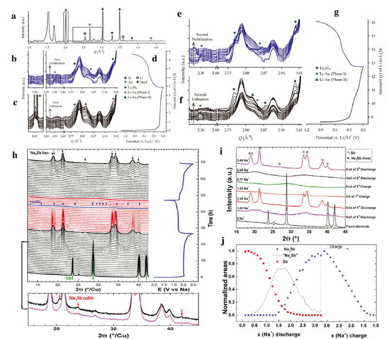 嵌入型负极材料:Li4Ti5O12具有零应力嵌入特性,良好的结构稳定性且可逆性较好,是一种很有前途的负极材料。但是其电子和离子电导率较低。基于此,研究人员采用了诸如表面包覆、金属离子掺杂及纳米化等方法来解决这个问题。如图4a所示,Sun等人用原位同步辐射XRD技术研究了Li4Ti5O12在钠离子电池中的首次充放电过程。在首次放电过程中Na6Li相形成,但对应的衍射峰在接下来的充电过程中消失。这说明电极材料中发生的反应应为相分离反应而不是固溶体型反应。Yu等人通过该技术发现电极材料的储钠能力与其尺寸之间存在依赖关系。