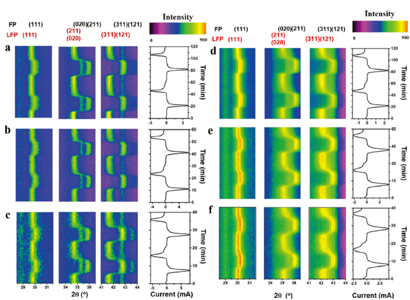 图2 聚阴离子化合物:CV循环中扫描速率对各个衍射峰型的影响:其中LFP表示磷酸铁锂,FP表示磷酸铁。a、d扫描速率1.4 mV/s,b、e扫描速率4.2 mV/s,c、f扫描速率4.2 mV/s。温度,293K(a-c),273K(d-f)