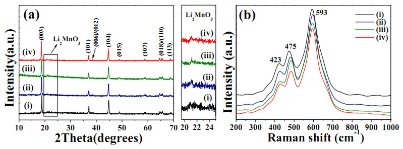 图1表明,样品具有典型的富锂层状材料的结构,Al、F共掺杂不会影响材料的晶体结构;拉曼光谱中423的峰位对应材料中Li2MnO3相。