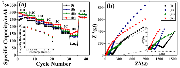 图4 (a)倍率曲线;(b)交流阻抗图谱;(i-iv)同图4(a-b)