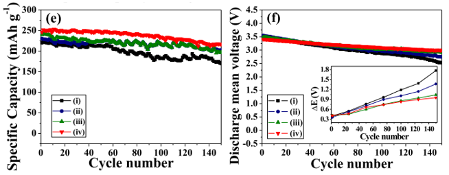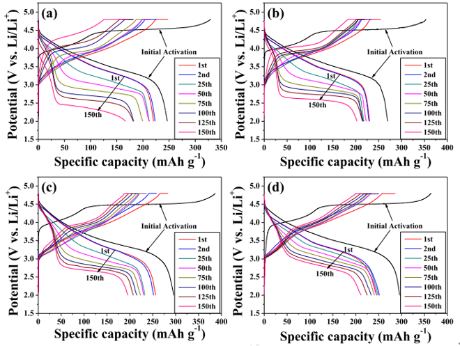 由上图的充放电曲线,掺杂元素Al、F的材料比未参杂的材料循环性能要好,其中Al、F双掺杂的性能最优,未掺杂材料150圈之后容量保持率77.3%(由220mAh/g到170mAh/g);双掺杂材料150圈之后容量保持率88.2%(由246mAh/g到217mAh/g)。Al、F共掺杂材料的尖晶石转化现象明显比未参杂的材料要弱很多,电压平台下降最缓慢,表面Al、F共参杂能有效抑制材料由层状相像尖晶石相转化,从而提高了其循环性能;另外,Al、F掺杂较F参杂的容量有所提升。