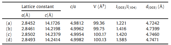 表1说明,Al、F共掺杂不会破坏材料原有的结构,而且双元素掺杂以后,其(003)晶面间距最大,降低了锂离子传输的势垒,有利于锂离子的嵌入和脱出。