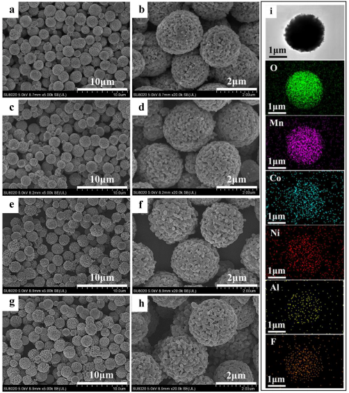 图3为其形貌图,材料为2~2.5μm的球状粒子,表面又由一次小粒子组成,为典型的微米-纳米二级结构。面扫描表明Al、F元素均已成功掺杂进入材料,元素分布较均匀。