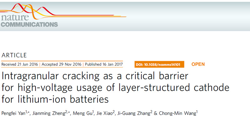 这篇文章2017年年初发表于Nature Communications上,文章研究切入点较为新颖。论文标题:Intragranular Cracking as a Critical Barrier for High-Voltage Usage of Layer-Structured Cathode for Lithium-Ion Batteries, Nat Commun, 8 (2017), 14101.