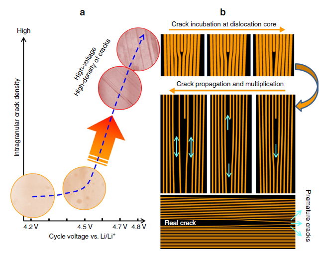 基于此,经过研究分析后,作者提出了晶粒内裂缝的演化机理,如图2所示:高的截止电压导致脱锂程度加深,这一方面会加剧结构的不稳定性,另一方面会增大晶粒内应力。当截止电压超过临界值时(4.5V到4.7V之间),晶粒内裂缝开始在位错核附近形成,晶粒内裂缝随着循环次数的增加逐渐长大,形成晶粒内裂缝的端点会做为新的晶粒内裂缝的起点,如图2(b)所示。