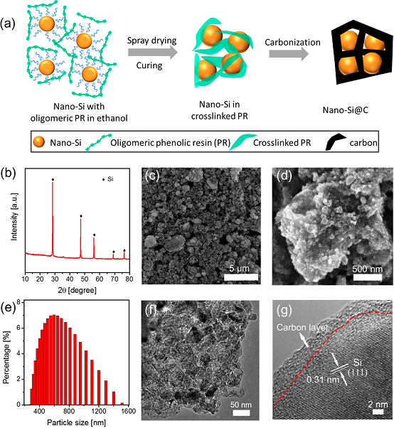 图3 (a)多孔nano-Si碳包覆示意图,(b-g) nano-Si@C的结构表征